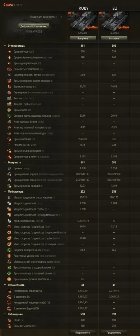Сравнение характеристик EU Pz.Kpfw. Tiger-Maus 120t и RUBY Pz.Kpfw. Tiger-Maus 120t:
