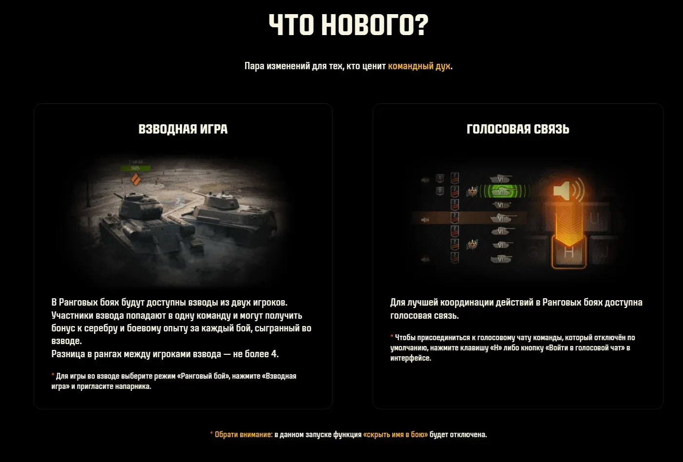 В Ранговых боях будут доступны взводы из двух игроков. Участники взвода попадают в одну команду и могут получить бонус к серебру и боевому опыту за каждый бой, сыгранный во взводе. Разница в рангах между игроками взвода — не более 4.