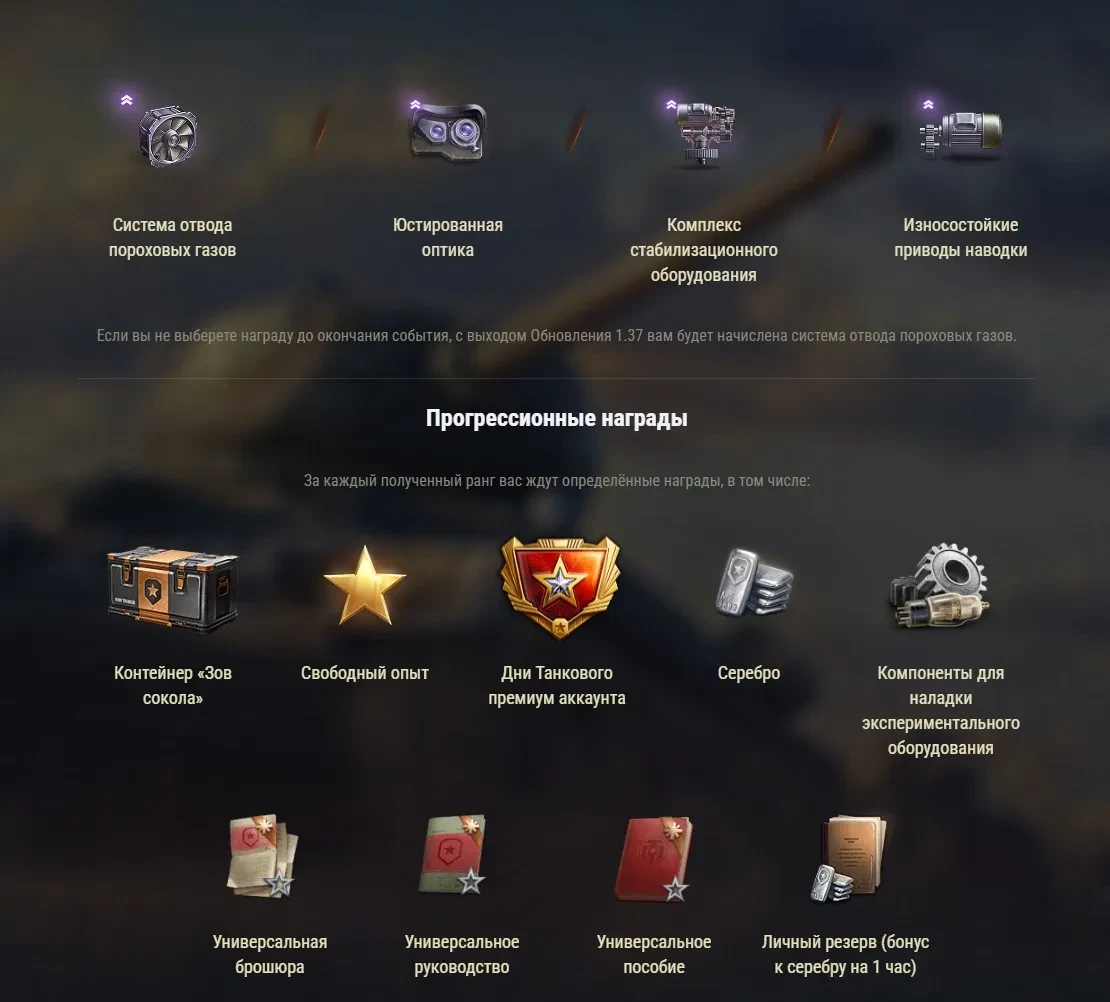 * Если получить все ранги, но не выбрать усовершенствованное оборудование до конца события, с выходом обновления 1.37 будет начислена система отвода пороховых газов.