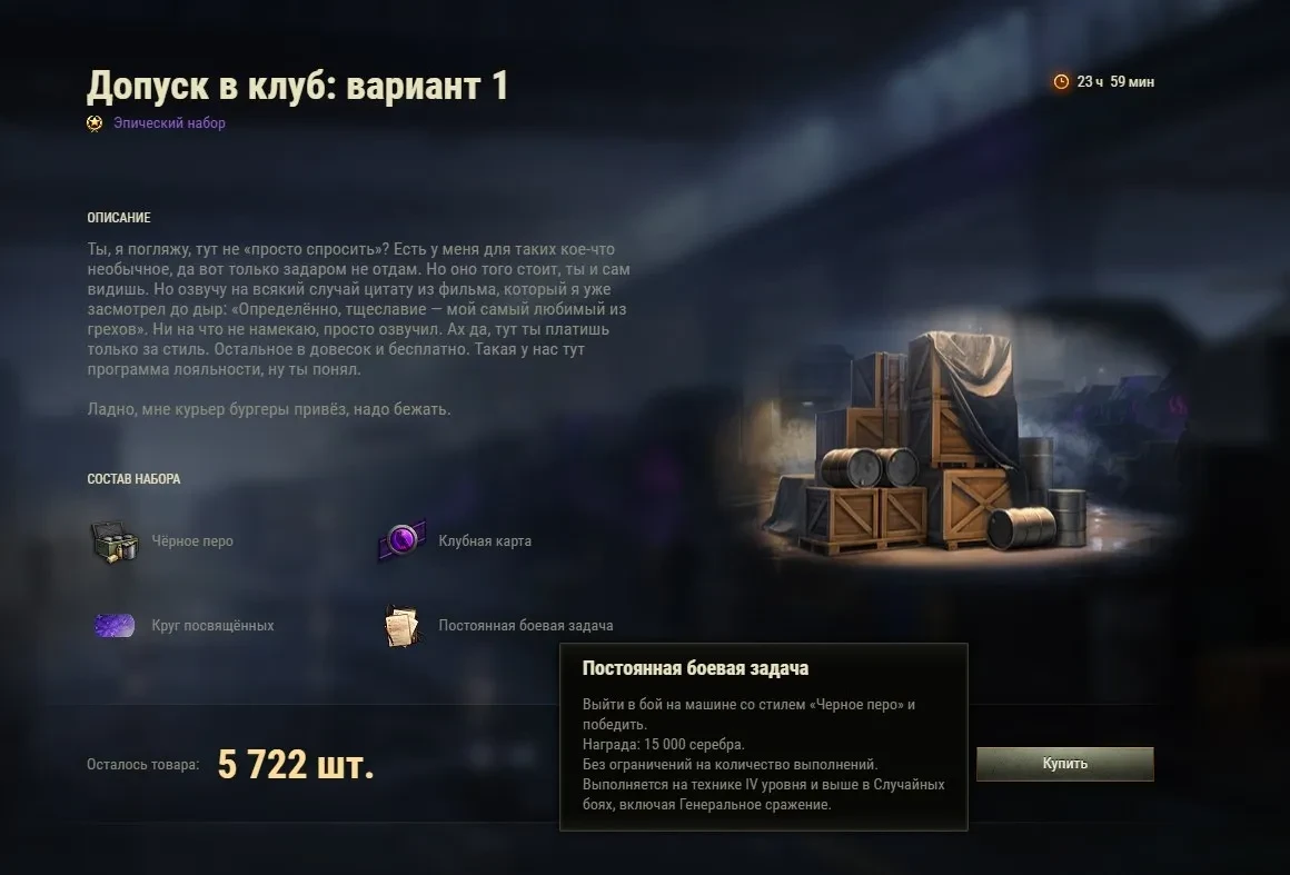 Доступно с 19:00 (МСК)! Получи допуск в закрытый клуб: 2D-стиль «Чёрное перо», нашивку, фон жетона и боевую задачу на 15 000 серебра без ограничений на количество выполнений. Всего 7 500 шт. Цена вопроса – (8 тысяч!!!)боны. Время пошло.