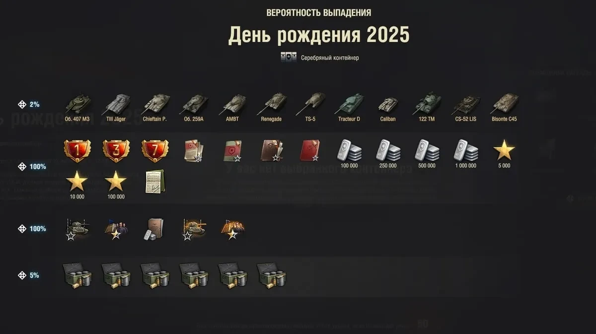 ** Если из контейнера выпал танк, который уже есть в ангаре, компенсация: 5 500 золота за технику 8 уровня; 8 750 золота за технику 9 уровня.