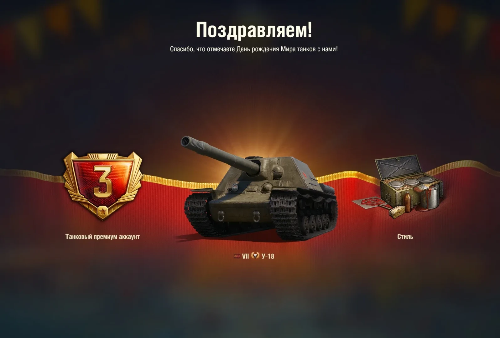 У-18 (советский премиум ПТ-САУ VII уровня), тематический 2D-стиль «Праздничная вечеринка» и 3 дня Премиум аккаунта начисляют при заходе в игру с 12 августа по 20 августа (03:00 МСК).