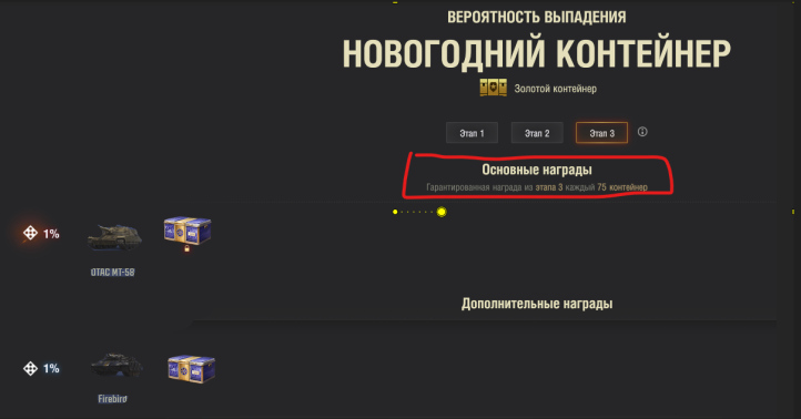 Значение гарантированных наград на каждом этапе разные: 35 контейнеров (этап 1), 50 контейнеров (этап 2), 75 контейнеров (этап 3).