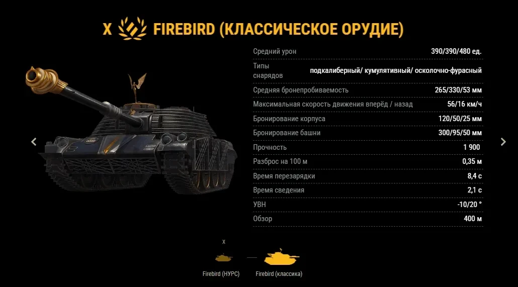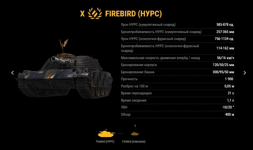 Средний танк X уровня Firebird оснащён НУРС-снарядами, обладает уникальными анимациями и ведёт счёт поверженных противников — всё это делает его по-настоящему особенным.