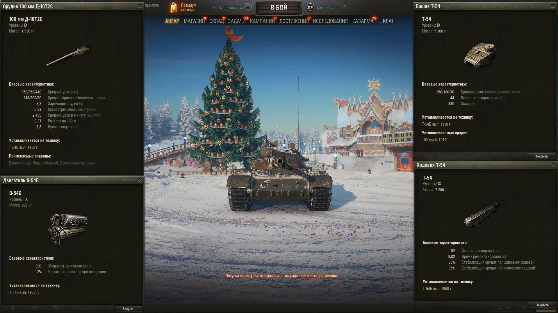 Т-54Б вып. 1958 г. (СССР, СТ-9, премиумный). У танка есть уникальная анимация, перед началом боя по бокам башни опускаются занавески, закрывающие тактические номера. Впервые можно было купить во время события «Время героев» (май 2025 года). Краткое название танка Т-54Б.
