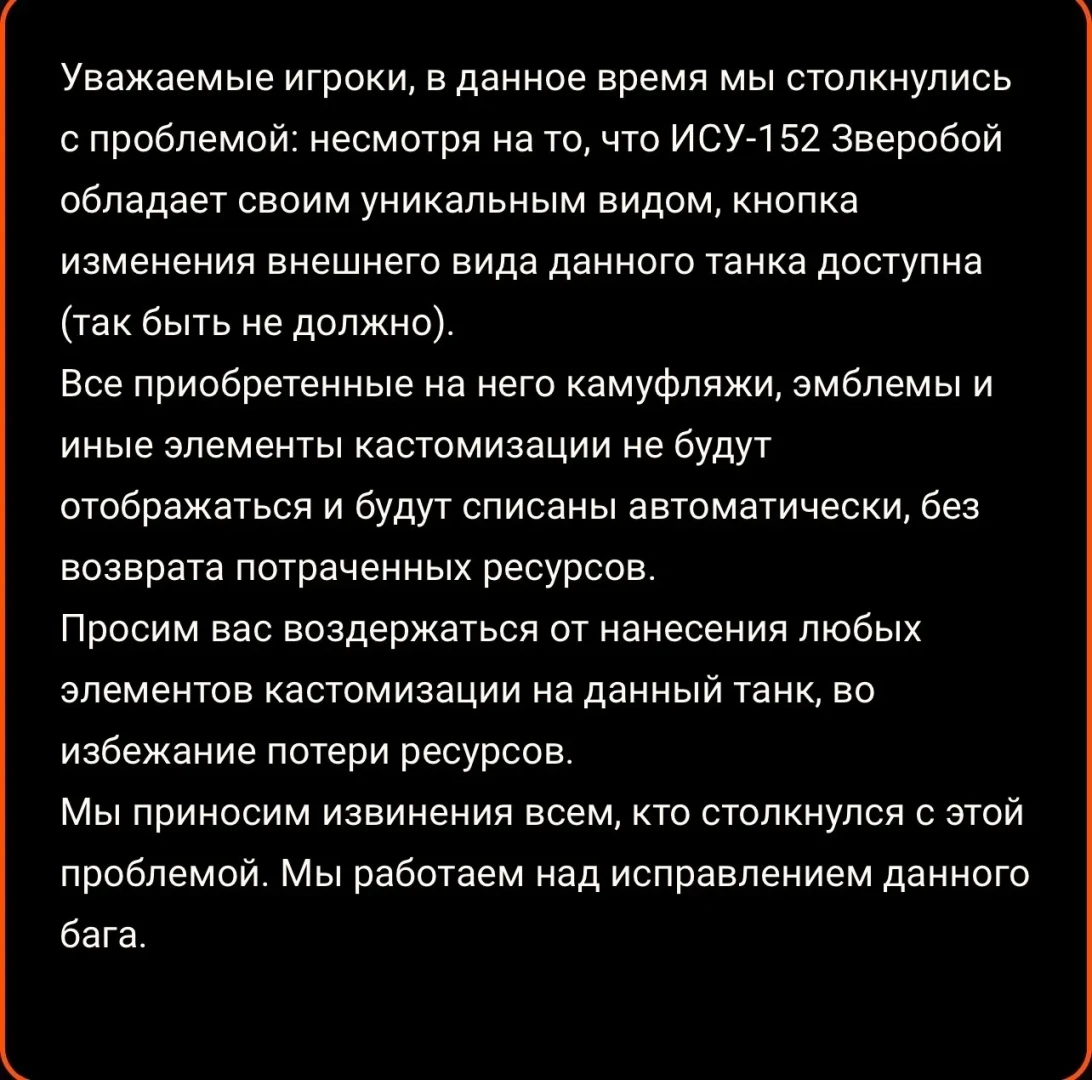 На данный момент проблема с внешним видом ИСУ-152 Зверобой — для неё активна возможность нанесения камуфляжей несмотря на то, что ПТ-САУ обладает уникальным стилем.