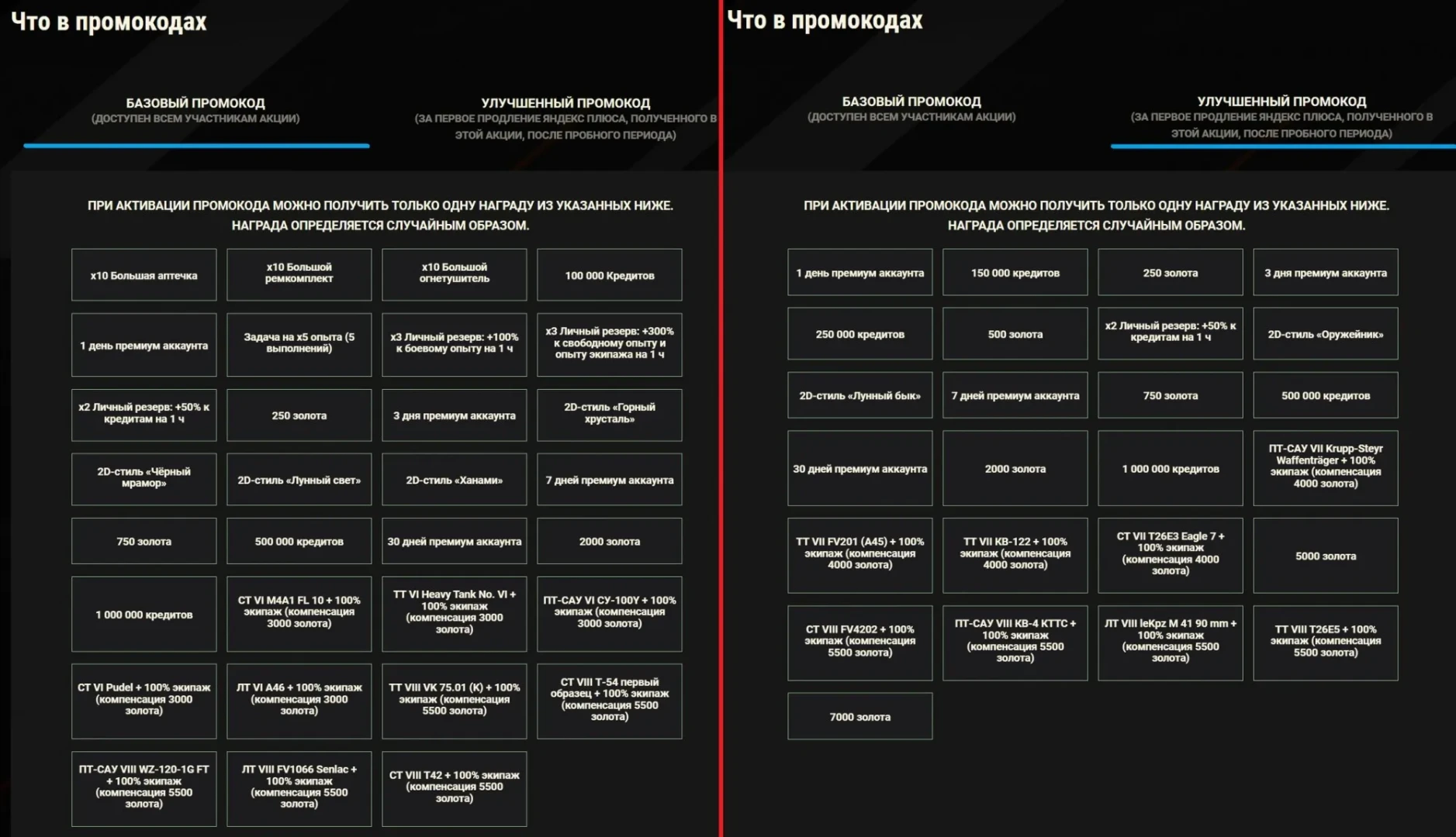 * При активации промокода можно получить только одну награду из указанных ниже. Награда определяется случайным образом!