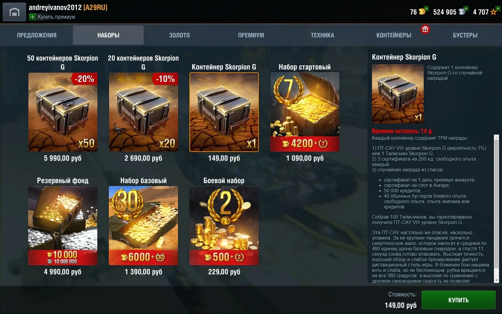 Так вот, что меня удивило разработчики предлагают купить "скорпа" в контейнерах с вероятностью выпадения 1%. Один такой контейнер стоит 149 рублей, а 50 шт. — 6.000 рублей, так вот если ваш уровень везения примерно никакой, то вам придется отдать за эту имбу целых 12.000 рублей (см. фото)!!! Как вам цена за прем танк 8 лвла, ПКшники? Да, безусловно, это мобильная игра и тут такая жёсткая система доната, но это уже что-то за гранью.