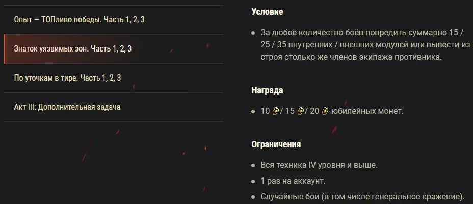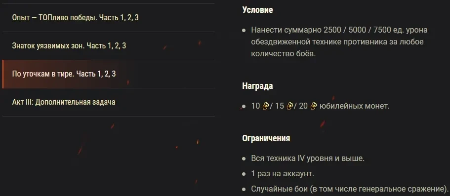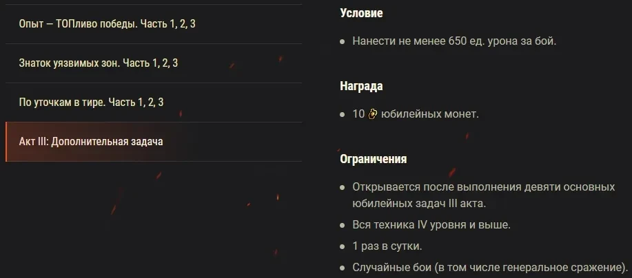 ** Все три блока задач выполняются параллельно. После выполнения всех юбилейных задач станет доступна дополнительная ежедневная задача, которую можно будет выполнить один раз в день. Награды за выполнение боевых задач суммируются при соблюдении всех условий и ограничений.
