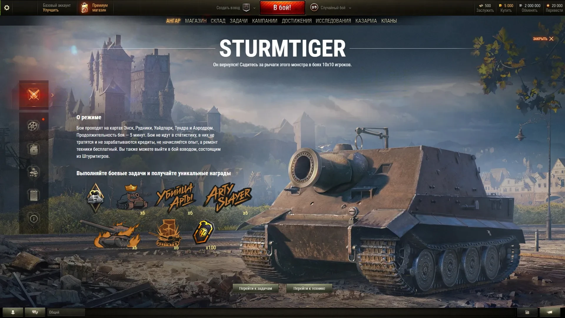 Со стартом Акта III легендарный «Штурмтигр», машина X уровня, появится в вашем Ангаре. Выберите его и нажмите кнопку «В бой!», чтобы сыграть в специальном режиме «Крадущийся тигр». Помните, что время доступности боёв ограничено и разнится в зависимости от сервера. Сражаться можно в одиночку или во взводе.
