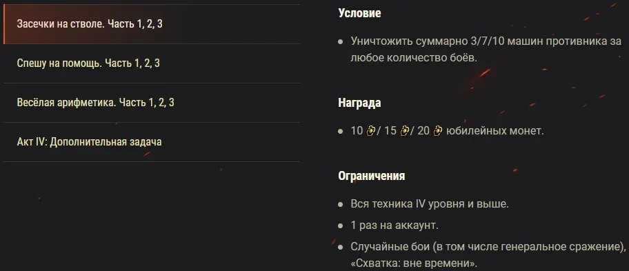 *** Все три блока задач выполняются параллельно. После выполнения всех юбилейных задач станет доступна дополнительная ежедневная задача, которую можно будет выполнить один раз в день. Награды за выполнение боевых задач суммируются при соблюдении всех условий и ограничений.