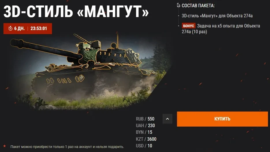 Также для вас доступен уникальный 3D-стиль «Мангут» (ссылка), который можно приобрести как отдельно, так и в больших наборах с танком.