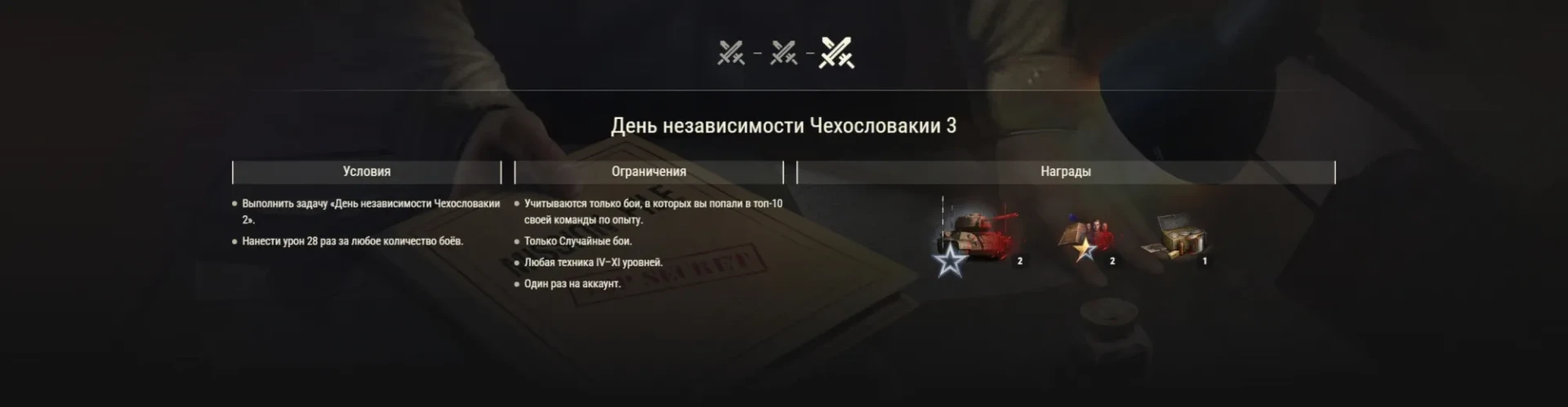 Выполните цепочку боевых задач и заработайте предметы в тематике Чехословакии, личные резервы и другие награды.
