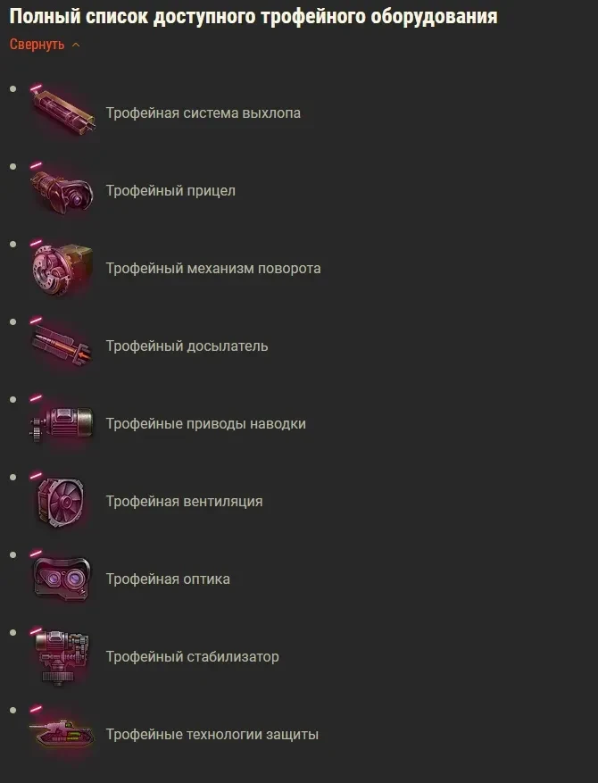 Полный список доступного трофейного оборудования — см. скрин 6.