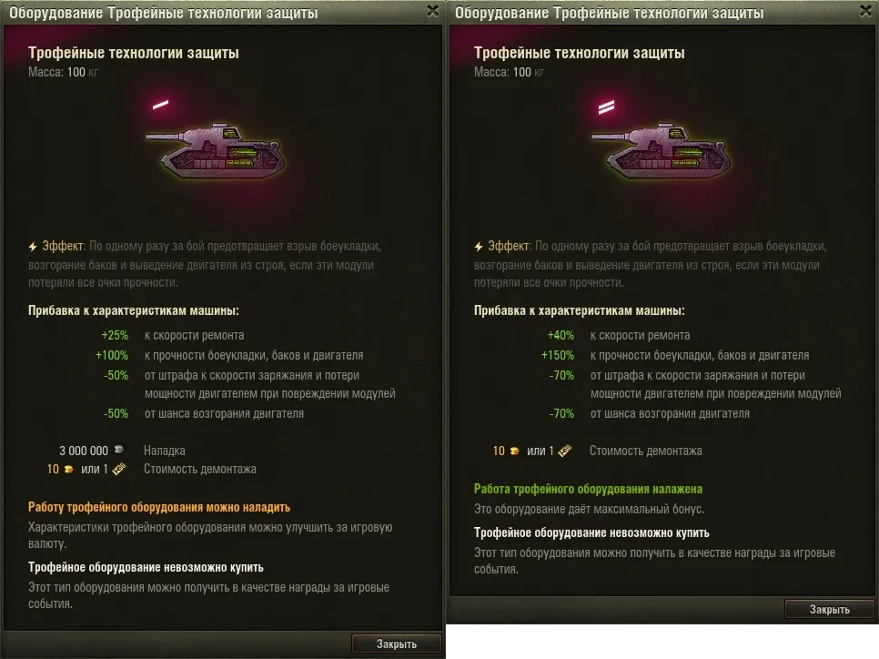 Эффект: По одному разу за бой предотвращает взрыв боеукладки, возгорание баков и выведение двигателя из строя, если эти модули потеряли все очки прочности.