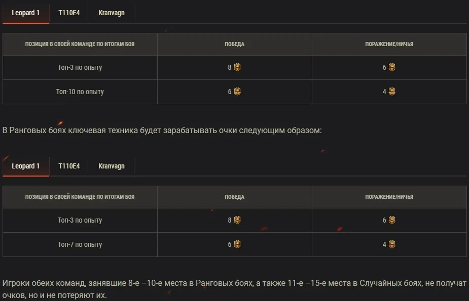 Игроки обеих команд, занявшие 8-е –10-е места в Ранговых боях, а также 11-е –15-е места в Случайных боях, не получат очков, но и не потеряют их.