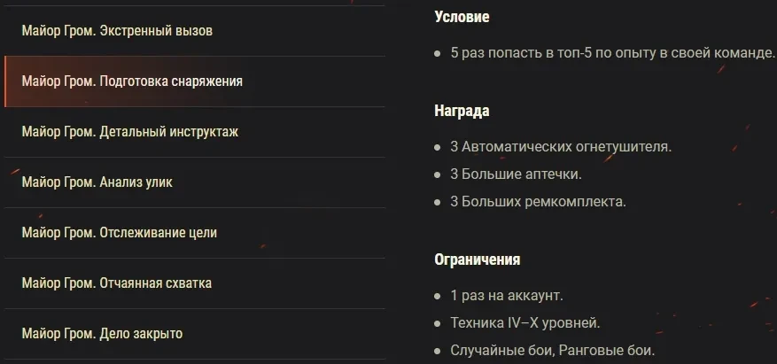 Награда за выполнение задач от майора Грома — одна из 17 единиц штатного оборудования на выбор. Выбрать оборудование можно в специальном экране сразу по выполнении задачи либо в меню «Склад» — «Поставки из тыла» в течение 30 дней после выполнения задачи.