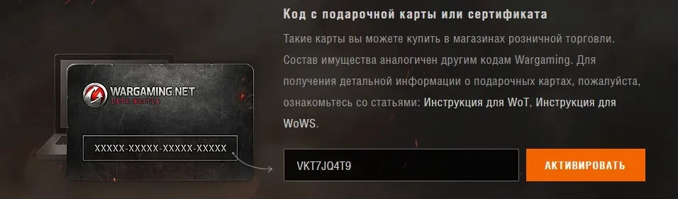 Предустановленный ввод кода: https://ru.wargaming.net/shop/redeem/?bonus_mode=VKT7JQ4T9 (нужно войти в аккаунт)