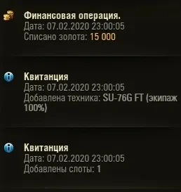 В 19:02 (МСК) 5-й лот СУ-76И (СССР, ПТ-3, прем), а точнее SU-76G FT ( Китай, ПТ-4, прокачиваемая) 5.000 шт. раскупили за примерно: 1 мин 56 сек.