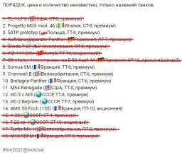 Уже начался 9 лот Чёрного рынка и мы всё ещё продолжаем идти по слитому списку. Скорей всего список уже не будут менять. Но т.к. дней до конца Чёрного рынка осталось всего ничего (последний лот 10 марта в 13:00 по МСК), не все танки из списка в итоге попадут в продажу.