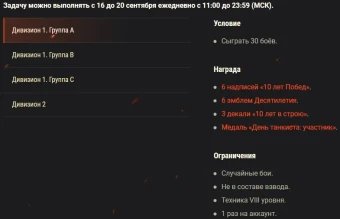 Всем участникам будет доступна одна и та же специальная боевая задача. Условия и награды у всех одинаковые, но, чтобы игроки понимали, в каком дивизионе или в какой группе они сражаются, у задачи будет четыре соответствующих варианта названия.