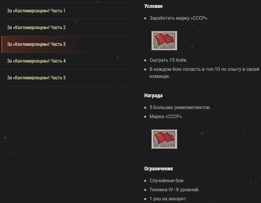 Боевые задачи для случайных боёв (Часть 2 - Часть 5) открываются последовательно друг за другом по мере выполнения. Боевую задачу на 10 боёв в событии «Дорога на Берлин» (Часть 1) можно выполнять параллельно с остальными.