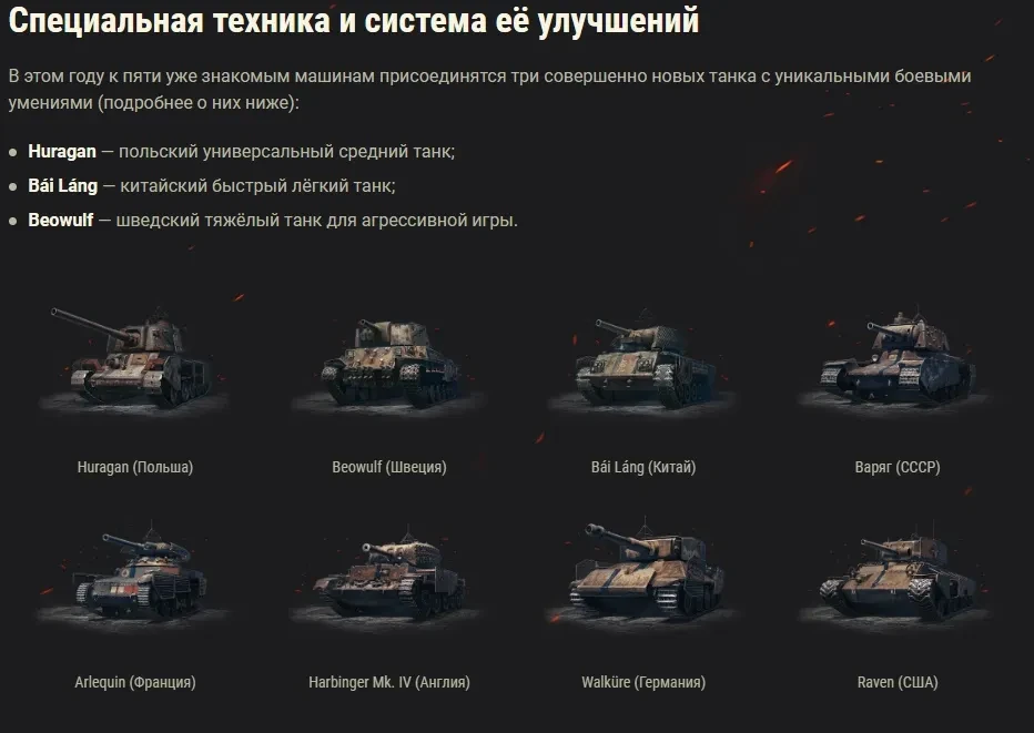 В этом году к пяти уже знакомым машинам присоединятся три совершенно новых танка с уникальными боевыми умениями (подробнее о них ниже):