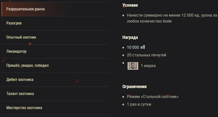 Специальные ежедневные задачи можно выполнять только в рамках «Стального охотника» и всего один раз в день. Наградой станут кредиты и стальные печати. Вы также можете выполнять дополнительные ежедневные задачи на мастерство и получать за это боны.