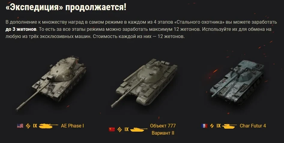 В дополнение к множеству наград в самом режиме в каждом из 4 этапов «Стального охотника» вы можете заработать до 3 жетонов. То есть за все этапы режима можно заработать максимум 12 жетонов. Используйте их для обмена на любую из трёх эксклюзивных машин. Стоимость каждой из них — 12 жетонов.