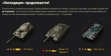 После «Экспедиции» все оставшиеся у вас жетоны будут автоматически компенсированы по курсу 1 жетон — 250 бон, даже если их будет достаточно для обмена на танк. Боны вы получите при входе в клиент игры.