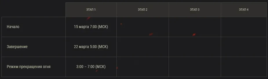 Каждый день будет действовать режим прекращения огня. Точное время указано в таблице ниже. Даты начала и окончания других предстоящих этапов «Стального охотника» будут известны позже, так что следите за новостями!