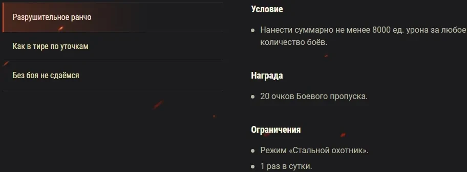 В режиме также будут доступны 2 боевые задачи, каждую из которых можно выполнить раз в сутки. Успешное выполнение каждой из двух ежедневных задач принесёт вам по 20 очков Боевого пропуска. Кроме того, для одиночных и взводных игроков будет доступна дополнительная многократная боевая задача для заработка кредитов.