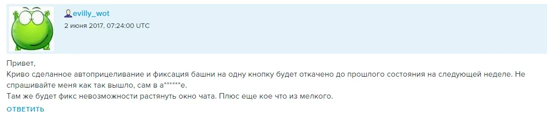 "Привет, криво сделанное автоприцеливание и фиксация башни на одну кнопку будет откачено до прошлого состояния на следующей неделе. Не спрашивайте меня как так вышло, сам в а******е.