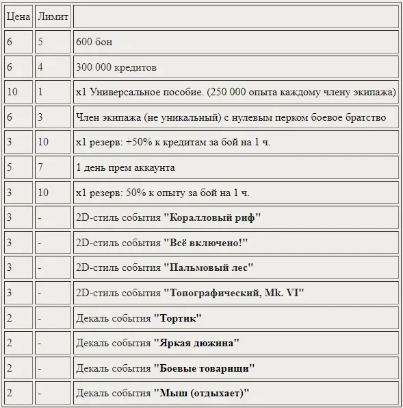 Половина (!!!) - тупые КАРТИНКИ, никак не влияющие на игру. Резервы, которые никто не использует, очередные члены экипажа (уже человек 20 сидят - некуда их пихать).Огонь, а не праздник! Все (ВСЕ!!, Карл) "подарки" получаются линейно просто по акции выходного дня или за БП. И в чем уникальность "празднования 12-летия"? Поменьше пафоса, геи.
