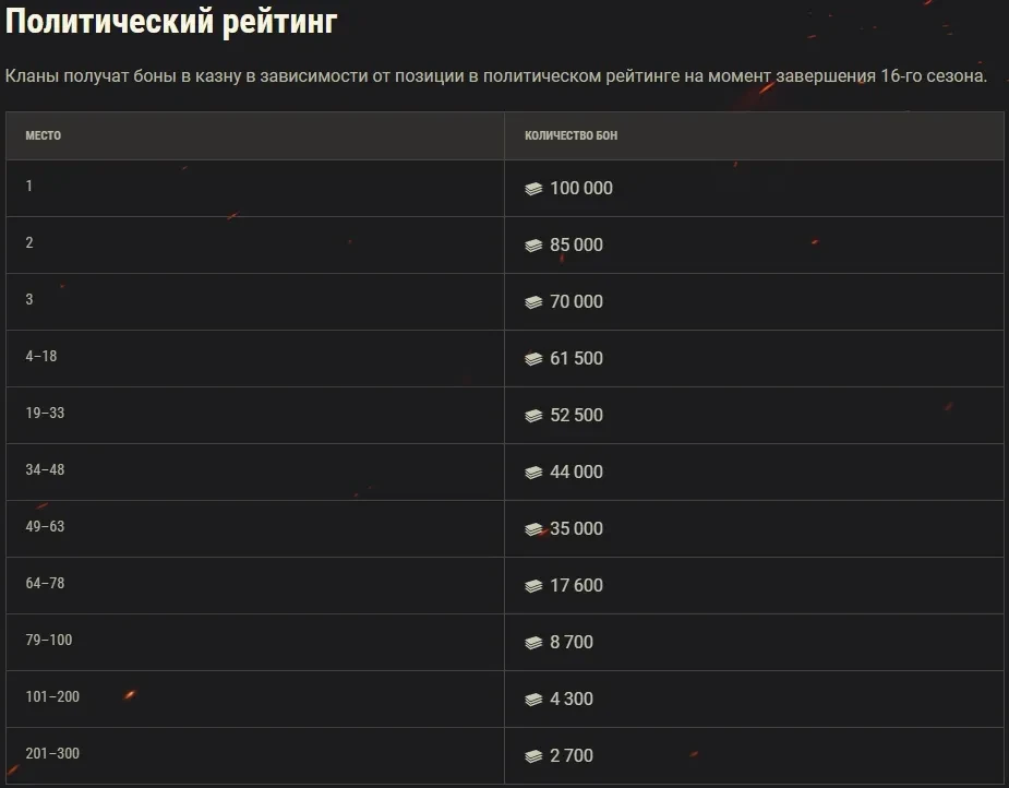Кланы получат боны в казну в зависимости от позиции в политическом рейтинге на момент завершения 16-го сезона.