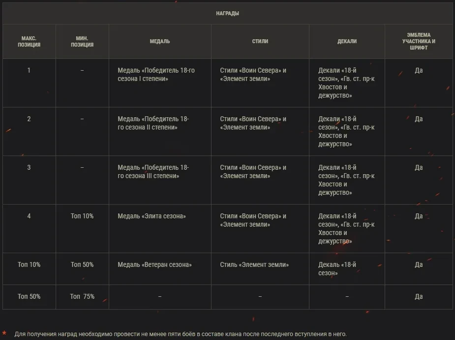 ** Для получения наград необходимо провести не менее пяти боёв в составе клана после последнего вступления в него.