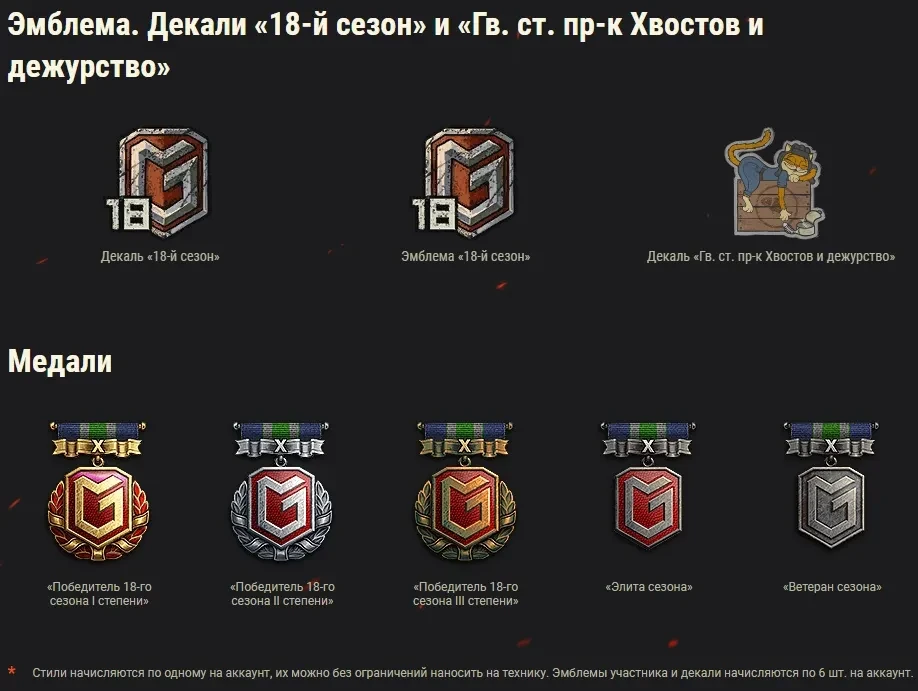 *** Стили начисляются по одному на аккаунт, их можно без ограничений наносить на технику. Эмблемы участника и декали начисляются по 6 шт. на аккаунт.