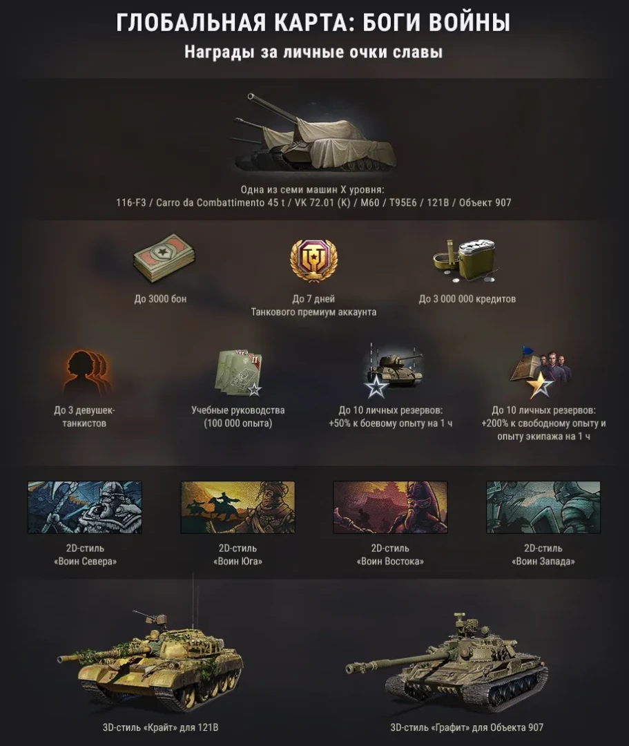 Каждый участник события «Боги войны» сможет получить награды за очки славы в магазине персональных бонусов. Ассортимент призов включает боны, учебные материалы, девушек-танкистов, дни Танкового премиум аккаунта, кредиты, личные резервы, а также два 3D- и четыре 2D-стиля.