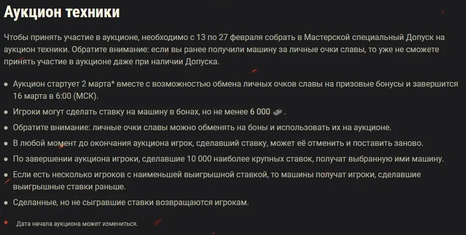 Чтобы принять участие в боновом аукционе, необходимо за время проведения ивента на ГК собрать в Мастерской специальный Допуск на аукцион техники (ранее было отыграть 5 боёв на ивенте). Обратите внимание: если вы ранее получили машину за личные очки славы, то уже не сможете принять участие в аукционе даже при наличии Допуска.