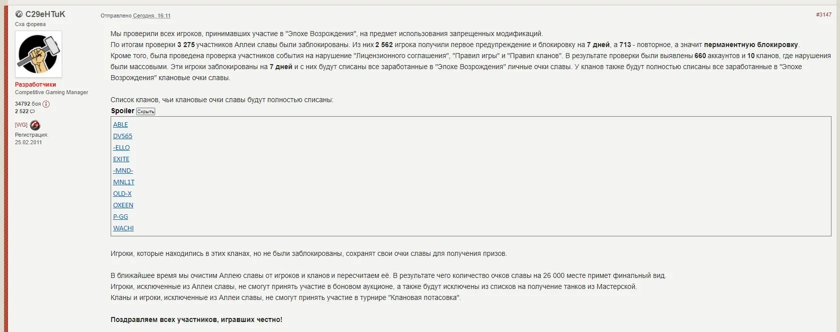 В результате проверки были выявлены 660 аккаунтов и 10 кланов, где нарушения были массовыми. Эти игроки заблокированы на 7 дней и с них будут списаны все заработанные в "Эпохе Возрождения" личные очки славы. У кланов также будут полностью списаны все заработанные в "Эпохе Возрождения" клановые очки славы.Список кланов, чьи клановые очки славы будут полностью списаны: