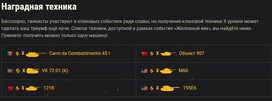 Бесспорно, танкисты участвуют в клановых событиях ради славы, но получение клановой техники X уровня может сделать ваш триумф ещё ярче. Список техники, доступной в рамках события «Железный век», вы найдёте ниже. Помните: получить можно только одну машину!