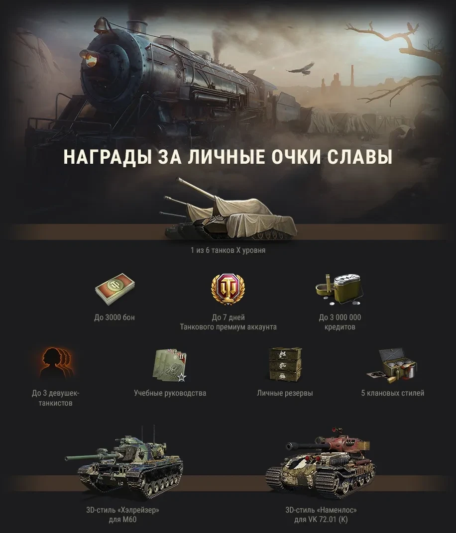 Помимо наградной машины X уровня, множества впечатляющих стилей, а также уникальных медалей и нашивок, вы сможете получить и другие ценные награды. Наряду с 3D- и 2D-стилями в магазине персональных бонусов будут боны, учебные материалы, девушки-танкисты, дни Танкового премиум аккаунта, кредиты и личные резервы.