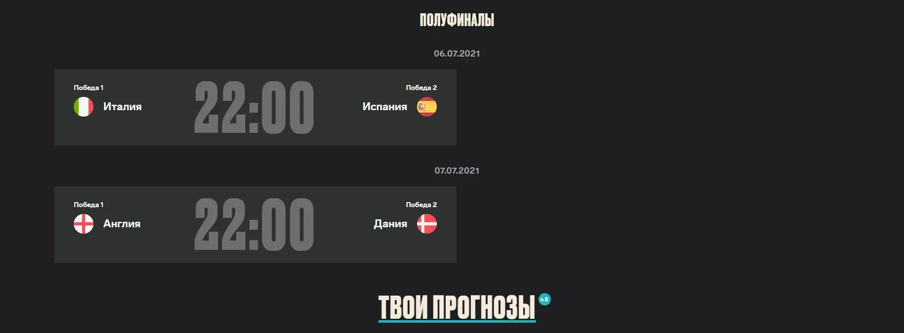 1/4 ЧЕ-2020 завершилась вчера, поэтому открылись прогнозы на полуфинал. След. матч. 6 июля в 22:00 (МСК).
