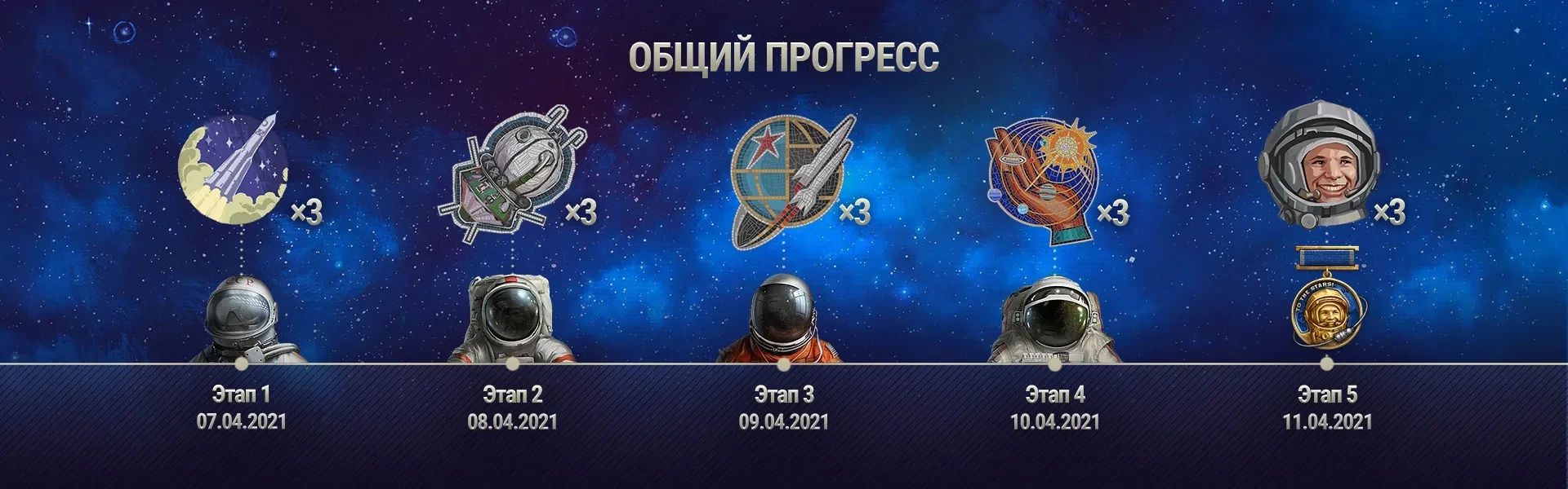 Кроме того, с 7 по 21 апреля Премиум магазин пополнится серией тематических наборов с большими скидками. Они будут разными по составу и стоимости, но главный элемент любого из них — бонус в виде Звёздных очков. Их можно использовать для приобретения элементов внешнего вида на специальном сайте события или потратить на открытие уровней личного прогресса для получения командира Юрия Гагарина.