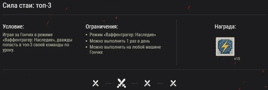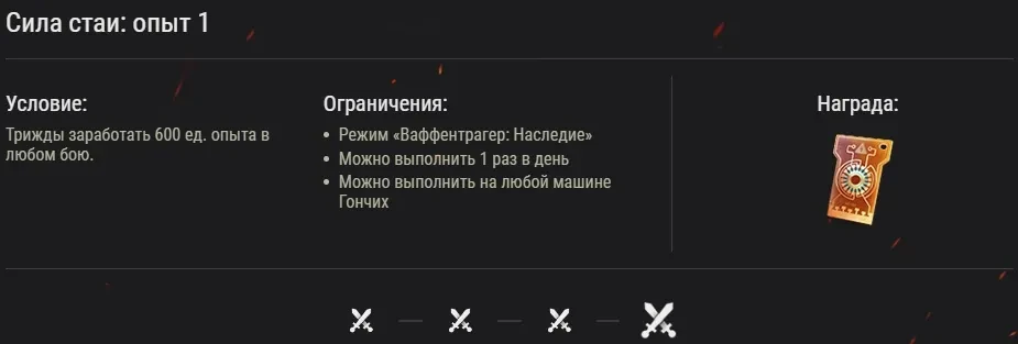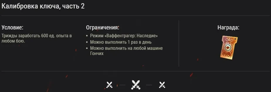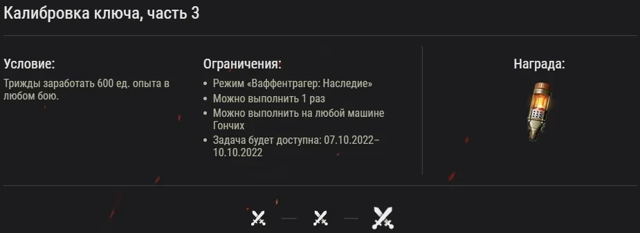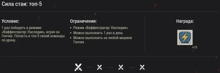На основе полученной от вас обратной связи об игровом событии «Ваффентрагер: Наследие» было принято решение о внесении изменений в следующие боевые задачи: «Сила стаи: топ-5», «Сила стаи: топ-3», «Сила стаи: урон», «Сила стаи: опыт», «Калибровка ключа, часть 2», «Калибровка ключа, часть 3».
