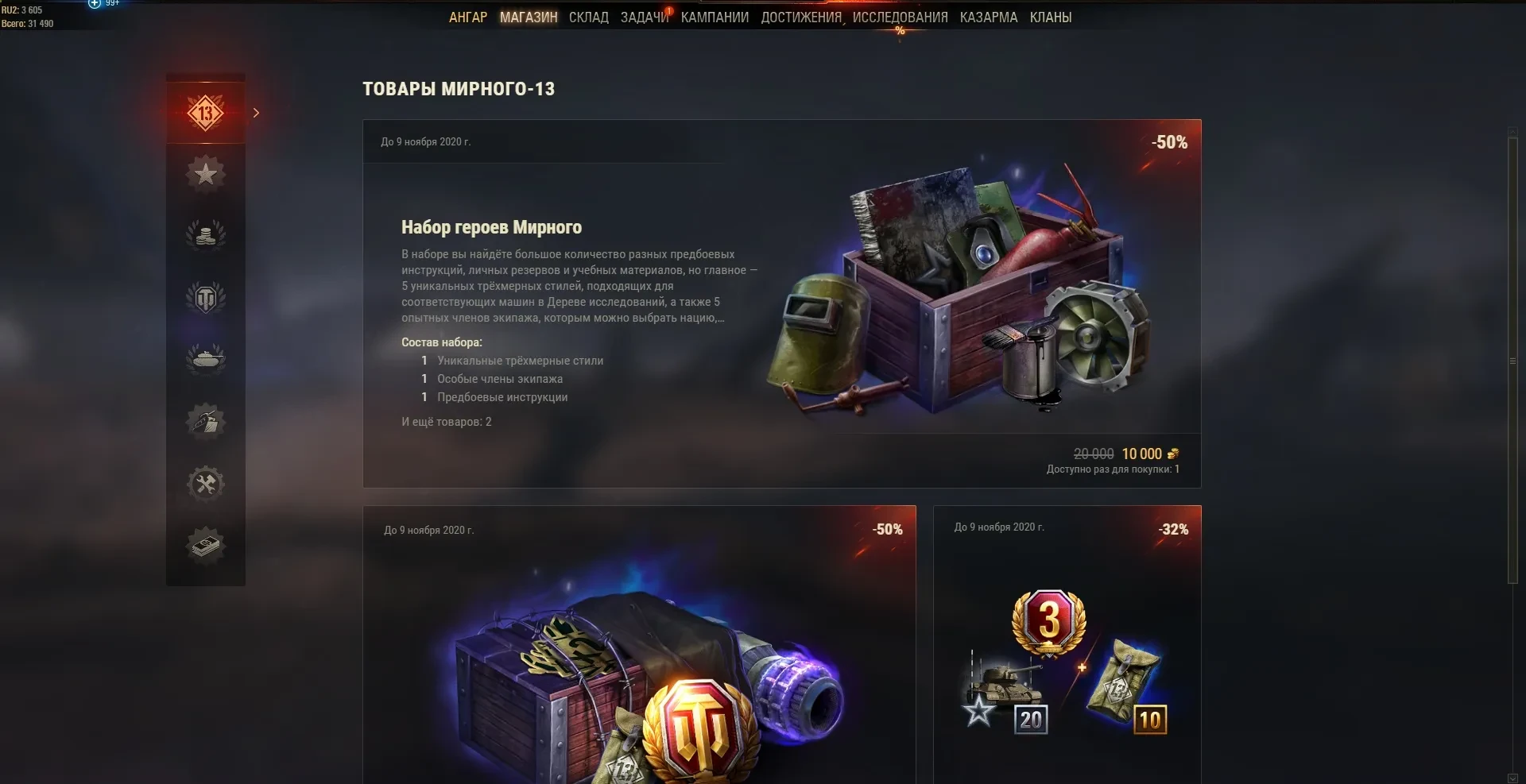 Также просто в Магазине (не во вкладке режима) есть ещё 3 набора для Мирного. Магазин == Товары Мирного-13 (1 вкладка). Здесь вообще находятся все возможные наборы.