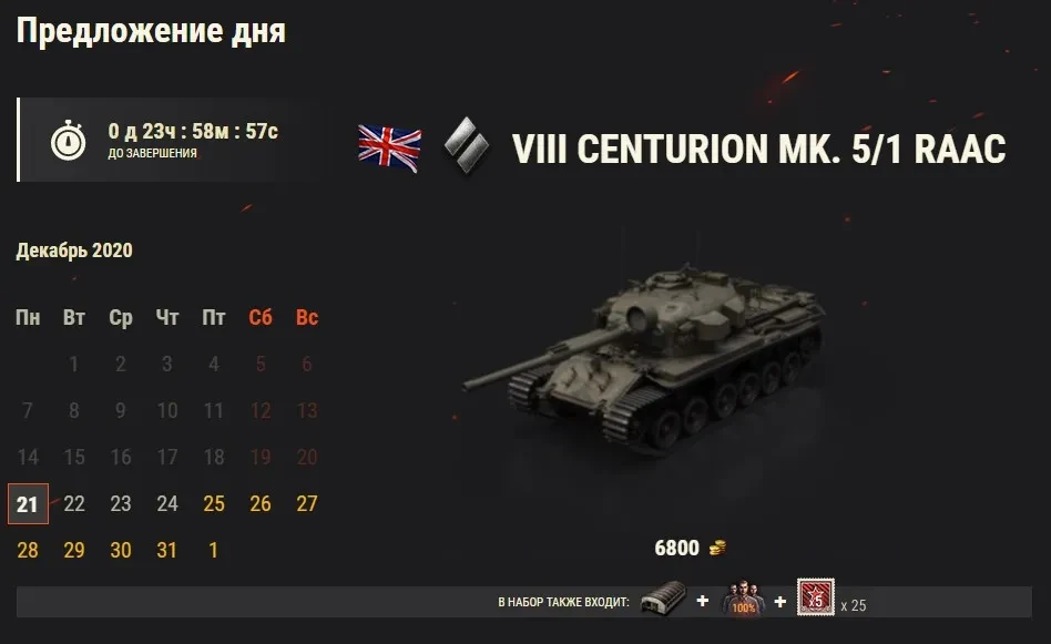 - С 21 декабря 09:00 (МСК) до 22 декабря 09:00 (МСК) премиум танк дня — Centurion Mk. 5/1 RAAC.
