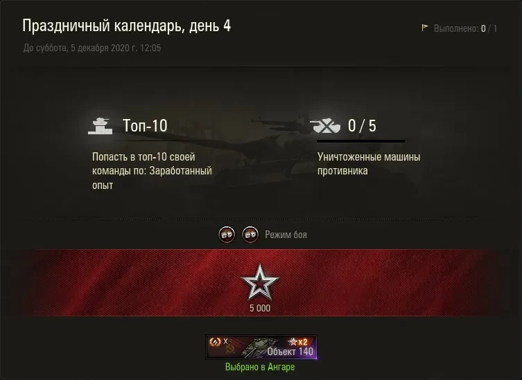 Не забывайте каждый день забирать спец. задачу дня в клиенте игры, в Новогоднем предложение дня (Ангар — стенд с календарём позади танка в поле). Для её выполнения есть только сутки, т.е. можно забрать и выполнить лишь до 5 декабря 09:05 (МСК). После она сгорит.
