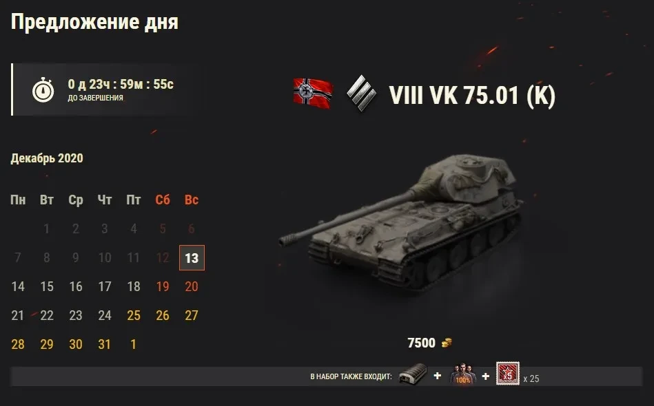 - С 13 декабря 09:00 (МСК) до 14 декабря 09:00 (МСК) премиум танк дня — VK 75.01 (K).