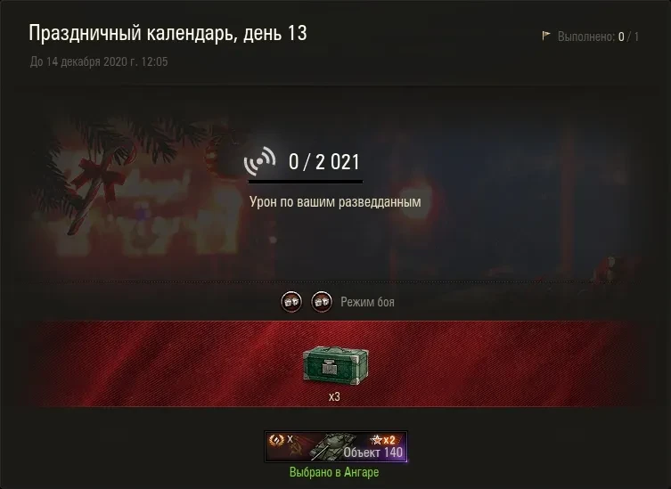 Не забывайте каждый день забирать спец. задачу дня в клиенте игры, в Новогоднем предложение дня (Ангар — стенд с календарём позади танка в поле). Для её выполнения есть только сутки, т.е. можно забрать и выполнить лишь до 14 декабря 09:05 (МСК). После она сгорит.